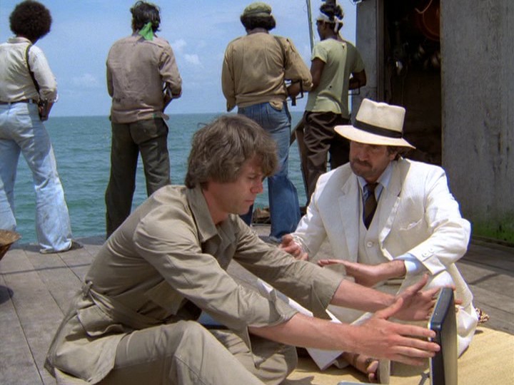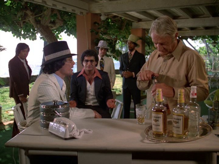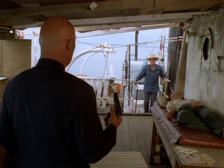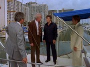 McGarrett shows up on his own, using a boat seized from some of Sandover's associates who were trying to stop the police boat. Face to face with the general, McGarrett accuses him of being the "Honolulu connection," and that it was his heroin that killed his daughter. (I dunno if this is serious or not…) Sandover acts like he wants to surrender, but someone sympathetic to him slips him a gun on his way to the upper deck where Oban awaits. There is a sudden outbreak of gunfire from Sandover's men; Sandover shoots Oban and is shot in turn. Both men die.
