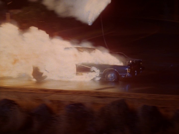 Conrad is later crushed by a car driven by Hansen, and the crime lab determines that the killer car has "paint of German manufacture" (she was driving a Mercedes). I don't understand why Conrad can't flee off to the side of the parking garage when being pursued by the car ... instead, he runs up against the garage wall and the car slams into him despite him having to step over a curb. When he is killed, the soundtrack goes dead and the pre-commercial "wave" following is totally silent, I think the only time this happens in the entire series.