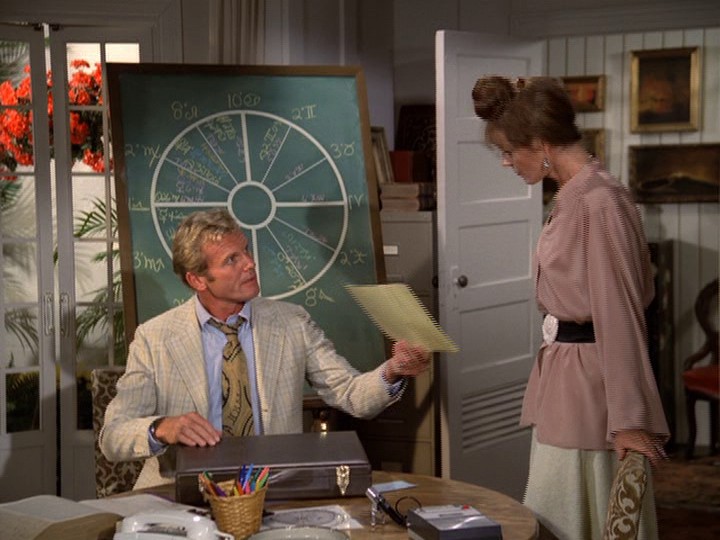 McGarrett is disturbed by this, and he goes to visit Agnes, suspecting that she is somehow involved with the killings. She is not; she has an iron-clad alibi for what just happened. But she unexpectedly pulls a lot of astrological gibberish out of the air, suggesting that whoever is involved is likely someone else with astrological experience: "The killer had to have done a chart on each of the murders. See, he knows about astrology. The Mars-Uranus aspect wasn't the only factor. See, each of the murders occurred when the transiting Moon held a negative aspect to the victim's natal Pluto. And that happens for one hour, three times a month … [That] means that the killer was both judge and jury. He had to work out the time of each murder very carefully." Told by Agnes that there are four or five other professional astrologers on the islands, McGarrett and Danno will check them out. Duke will look further into the backgrounds of the people who were killed.