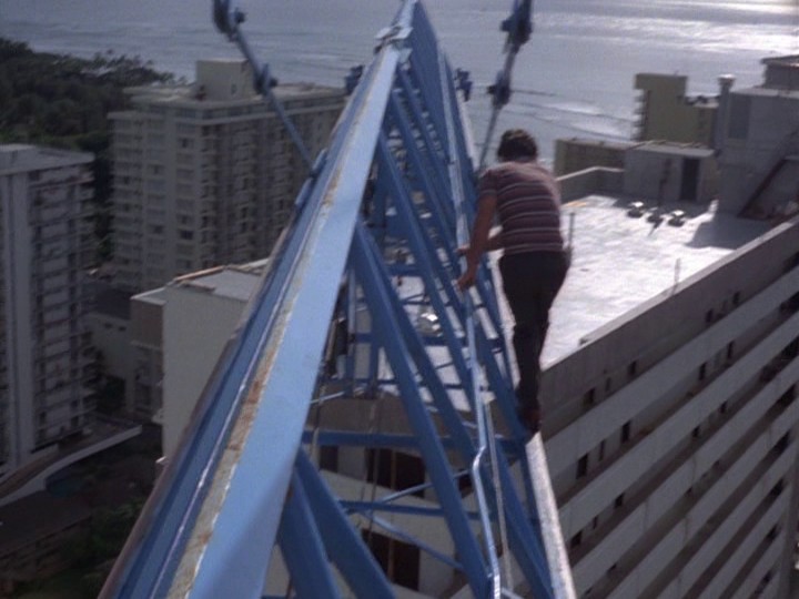 McGarrett pursues Sandover on to one of the cable cars. The following sequence rivals the construction crane antics in the previous show, "The Skyline Killer" with McGarrett getting into the car despite Sandover's attempts to keep him out, and then fighting with Sandover as the car travels from 150-300 feet above the water below. The editing in this sequence is not bad, though the part where Sandover gets to the roof of the car and McGarrett then climbs up and tries to grab his leg is silly. The reactions of Danno, who is in the following car, are a bit more low-key than those he had in the previous show. From the roof of the car, Sandover manages to grab some triangle-shaped thing on the cable above perhaps connected with maintenance or an emergency and escape, though you have to wonder why the cops wouldn't alert the people at the other end of the ride.