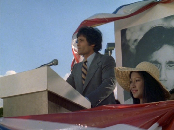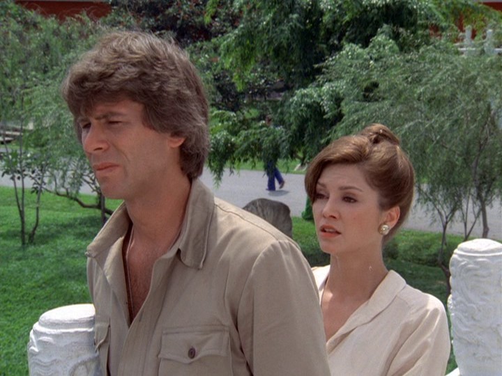 We have already met Sandover (Barry Bostwick), who is very much alive and in Singapore at the moment. He has become a Southeast Asian drug kingpin and is freaking out because the man who "makes the phone calls" for him, John Cossett (George "James Bond" Lazenby) used Ramos as a mule to transport the drugs to Hawaii. She was romantically involved with Sandover, and was also the daughter of General Oban (Lawrence Dobkin), a local bigshot whose significance is mysterious. His business card reads "Universal Commercial Operations International Limited." Chu later says Oban has "Many irons in the fire. Many fires. He's a very influential man."
