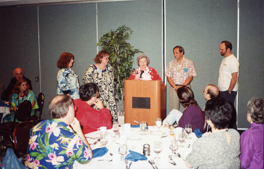 ▩ Karen Rhodes (center) thanks those who helped at the convention. Standing from left to right: Kathy Harter, Sylvia Stoddard, Dennis Chun, Chip Copper. Seated at left table: Ron Feinberg, Rita Ractliffe. Seated at front table: Mark Roland, Bill Koenig, Julie Helmer, Mark Musante, Mrs. Q, Tammy Jordan.