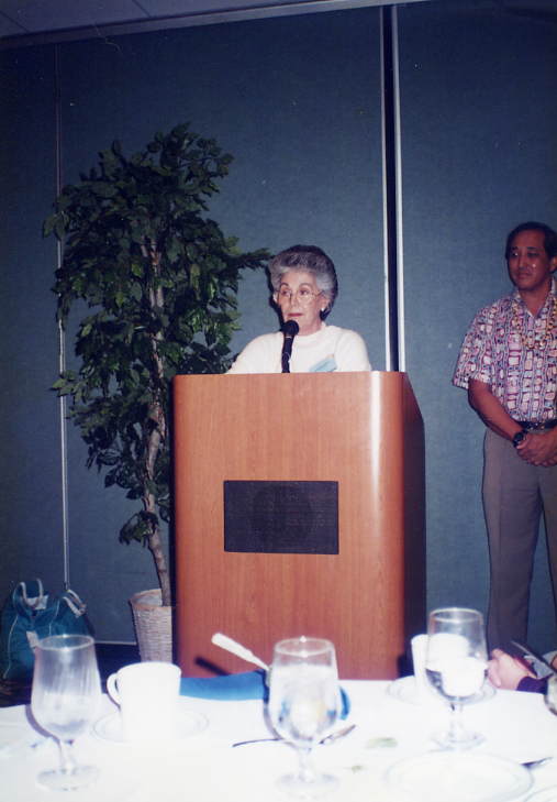 ▩ Mrs. Rose Freeman, wife of the late creator of Five-O, addresses the Burbank banquet. Dennis Chun looks on.