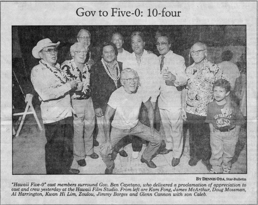 ▩ Five-O actors with Hawaiian governor Ben Cayetano at the Hawaii Film Studio (from Honolulu Star-Bulletin).