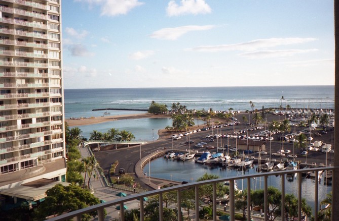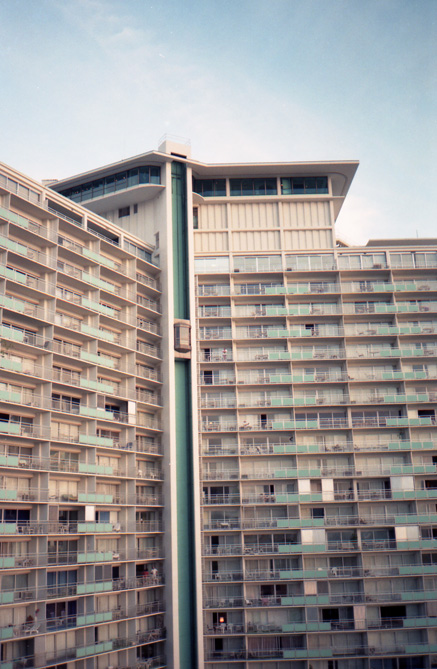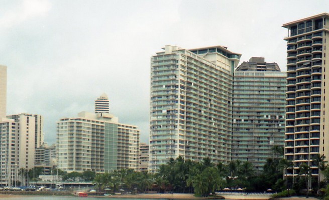 ▩ Looking up from the beach at the Ilikai Hotel with its famous balcony.