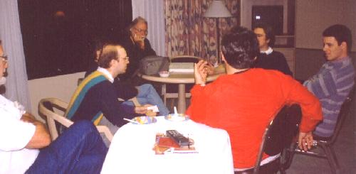 ▩ Frank Booth, Mark Musante, unidentified person behind Mark (possibly Julie Helmer), Tim Ryan (Honolulu Star-Bulletin reporter), Bill Koenig, Mike Quigley, Todd Witteles at Burbank. Photo by Karen Rhodes.