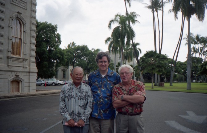 ▩ Doug Mossman, Harry Endo and James MacArthur outside the Iolani Palace, right below McGarrett's office.