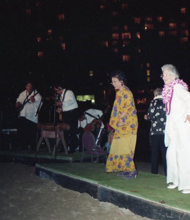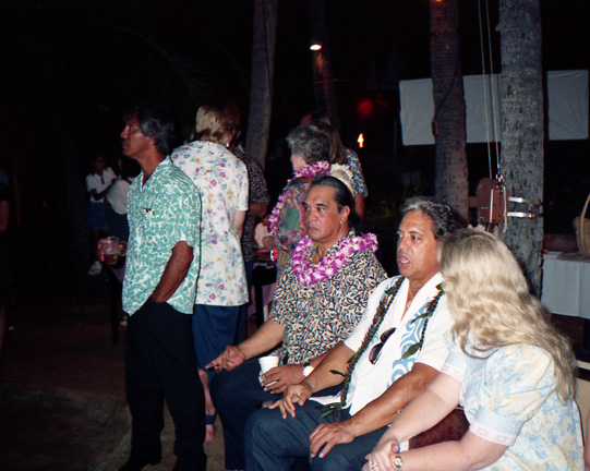 ▩ Luau scene with (from left) Zoulou's brother, Moe Keale, Zoulou and unidentified woman. Behind are fans, including Tammy Jordan.