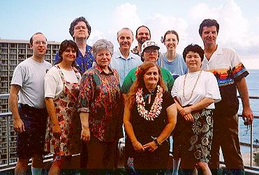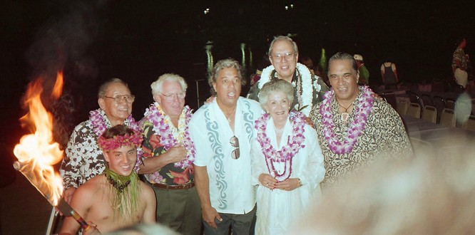 ▩ Five-O fans at the luau in Honolulu. From left: Sylvia, Jerry, Karen (in front), Michael, Julie, Mark, Chip, Dennis, myself, Tammy.