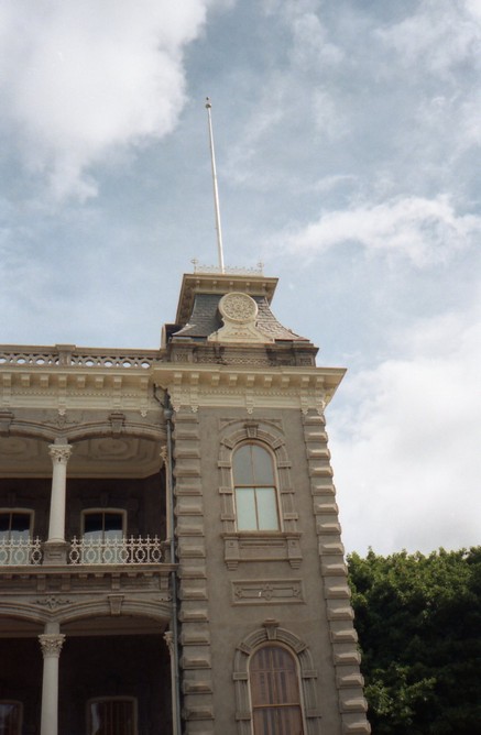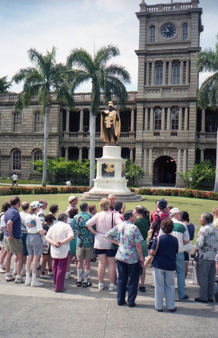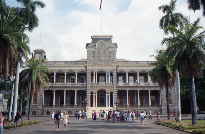 ▩ The Iolani Palace, Five-O headquarters, surrounded by fans on the Honolulu tour. McGarrett's office is on the right, obscured by the palm tree.