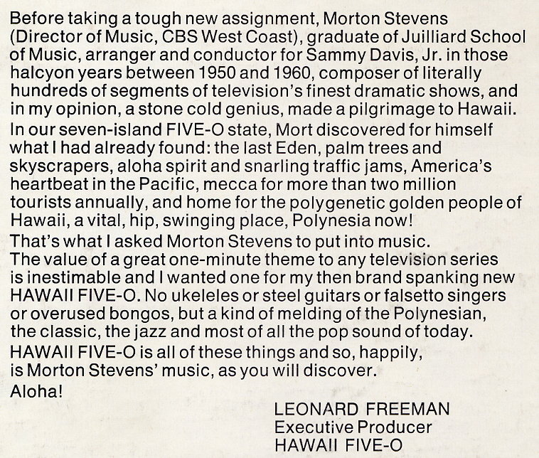 Morton Stevens, who died November 11, 1991 of cancer. He composed music for other TV shows like Police Woman, Gunsmoke and The Wild, Wild West, arranged music for the Boston Pops, and was musical director for concert tours of Sammy Davis Jr., Dean Martin, Frank Sinatra and Liza Minnelli.Is the soundtrack to Hawaii Five-O available?