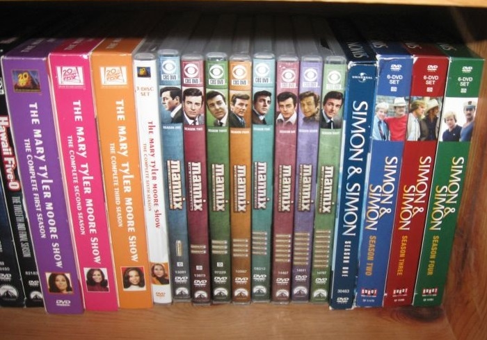 Here is the lot of Mannix on one of my shelves, between Mary Tyler Moore (I have seasons 1-3, and season 6, of that 1970-77 CBS comedy) and Simon & Simon (I have the first four seasons' worth [1981-85] of that CBS detective series).