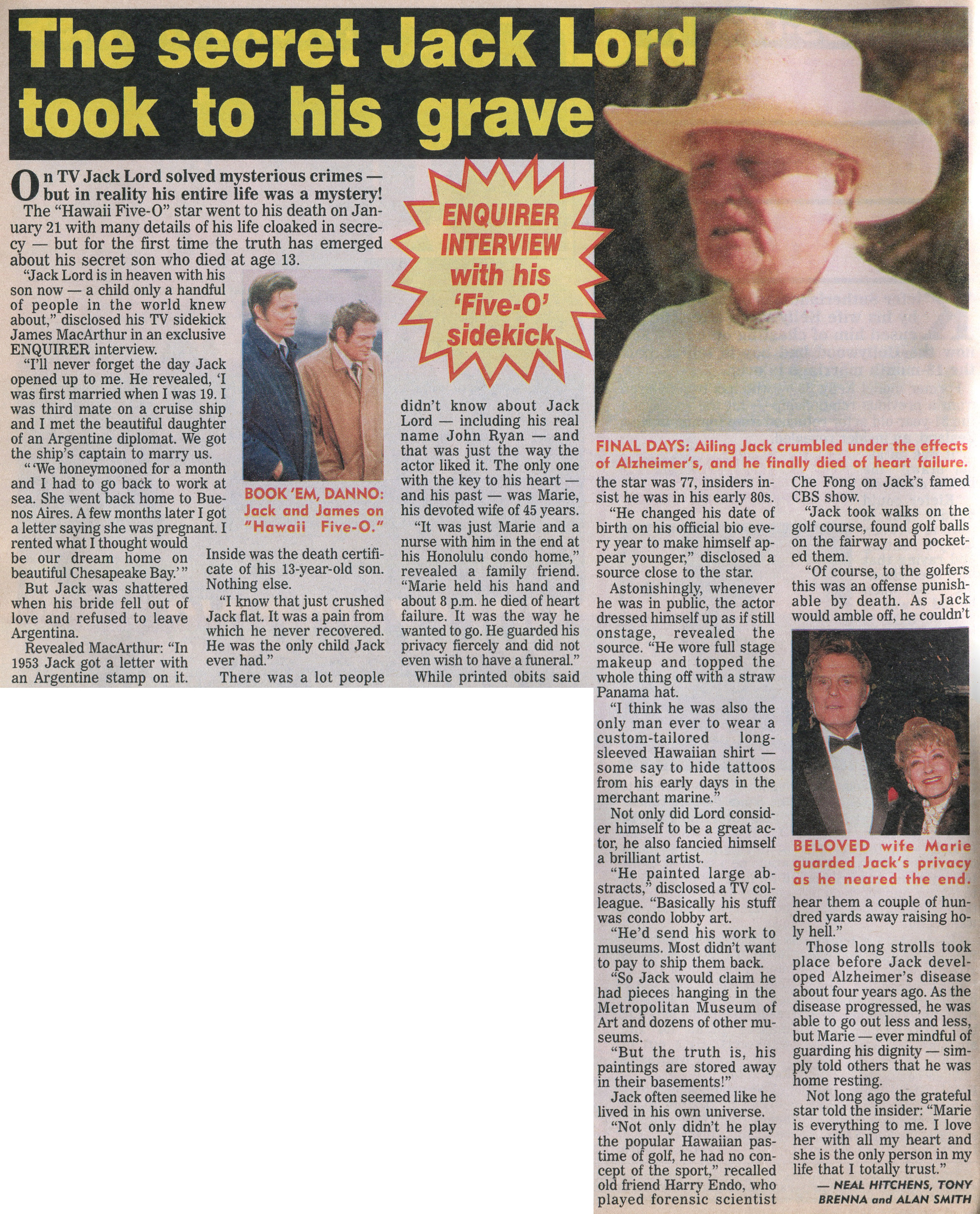 Jack Lord played Steve McGarrett, head of an elite state police unit investigating “organized crime, murder, assassination attempts, foreign agents, felonies of every type.” James MacArthur played his second-in-command Danny (“Danno”) Williams, with local actors Kam Fong, Zulu, Al Harrington, Moe Keale and Herman Wedemeyer as well as Sharon Farrell and William Smith playing members of the Five-O team over its 12 years. The series was notable for the guest actors who appeared in episodes, including Ed Asner, Hume Cronyn, Patty Duke, Helen Hayes, Robert Loggia, Herbert Lom, Gavin MacLeod, Sal Mineo, Ricardo Montalban, Leslie Nielsen, Geraldine Page, Eleanor Parker, Jean Simmons, Robert Vaughn, and many more. McGarrett’s nemesis, the evil Wo Fat — “a Red Chinese agent in charge of the entire Pacific Asiatic theatre” — was played by Khigh Dhiegh.