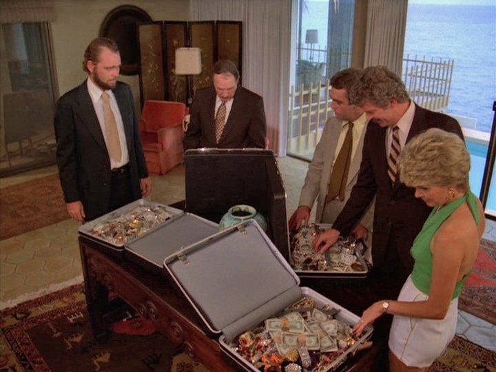 It is determined that Walden was shot with one of Rathman's guns, a Belgian 10.35 double-action revolver, so suspicion now begins to fall on the foundation's boss. After Kent is found dead on Rathman's yacht, McGarrett has Rathman confined to a hotel room guarded by a policeman (Don Pomes) rather than a jail cell. Rathman subsequently hypnotizes this cop in a stereotypical manner with a swinging watch (I'm not making this up) and escapes.