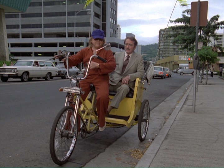 While McGarrett is waiting for the stooge, he is entertained by a snake charmer who has a cobra. McGarrett tells the guy, "Okay, beat it, pal. I don't dig snakes." Dolores shows up 3 minutes and 40 seconds after McGarrett arrived, somehow knowing exactly where he went. When she enters the cable car station, she sees her husband, and screams his name. McGarrett, who has met the stooge outside, pushes the guy down a hill where he is busted by several undercover cops under Danno's direction.