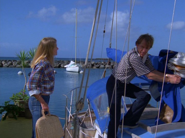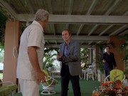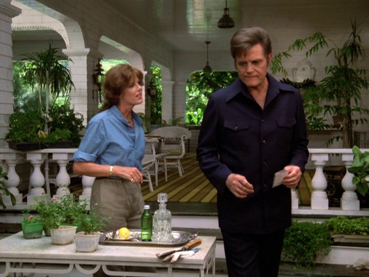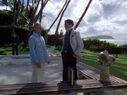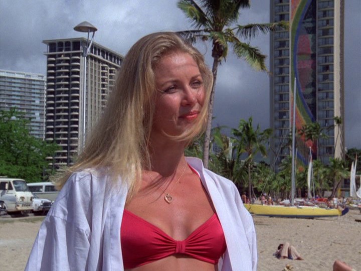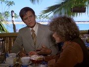 Over a drink (just her, not McGarrett — again!), she tells him, "I'm still married to Luke. You can't kill what I feel here," adding, "I've had other men. I'm not pristine." McGarrett tells her, "I must warn you that if your husband is alive, he may be engaged in some very serious and ugly criminal operation. And if I find him, he may spend the rest of his life in Leavenworth Prison." McGarrett gets a call from one of her husband's stooges, wanting to arrange payment for the ring.