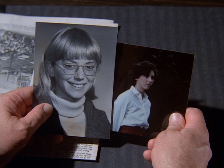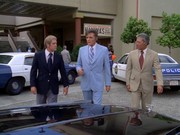 Conrad is later crushed by a car driven by Hansen, and the crime lab determines that the killer car has "paint of German manufacture" (she was driving a Mercedes). I don't understand why Conrad can't flee off to the side of the parking garage when being pursued by the car ... instead, he runs up against the garage wall and the car slams into him despite him having to step over a curb. When he is killed, the soundtrack goes dead and the pre-commercial "wave" following is totally silent, I think the only time this happens in the entire series.