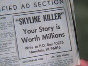 • Klane's ad that the killer's story is "worth millions" is located in the classified section of the paper, where there are some oddly misplaced ads. For example, under Automobiles - Used, it says "Talented lady, much to offer, seeks quality lifetime mate, a tall man, 45 plus, accustomed to and able to provide the best. Full detail" while under Help Wanted, there is an ad reading "Lonesome bachelor wants to meet refined lady."
