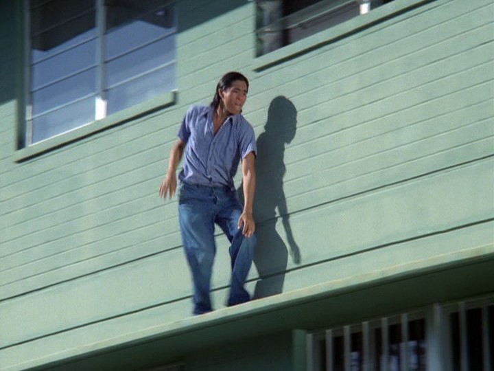 McGarrett pursues Sandover on to one of the cable cars. The following sequence rivals the construction crane antics in the previous show, "The Skyline Killer" with McGarrett getting into the car despite Sandover's attempts to keep him out, and then fighting with Sandover as the car travels from 150-300 feet above the water below. The editing in this sequence is not bad, though the part where Sandover gets to the roof of the car and McGarrett then climbs up and tries to grab his leg is silly. The reactions of Danno, who is in the following car, are a bit more low-key than those he had in the previous show. From the roof of the car, Sandover manages to grab some triangle-shaped thing on the cable above perhaps connected with maintenance or an emergency and escape, though you have to wonder why the cops wouldn't alert the people at the other end of the ride.