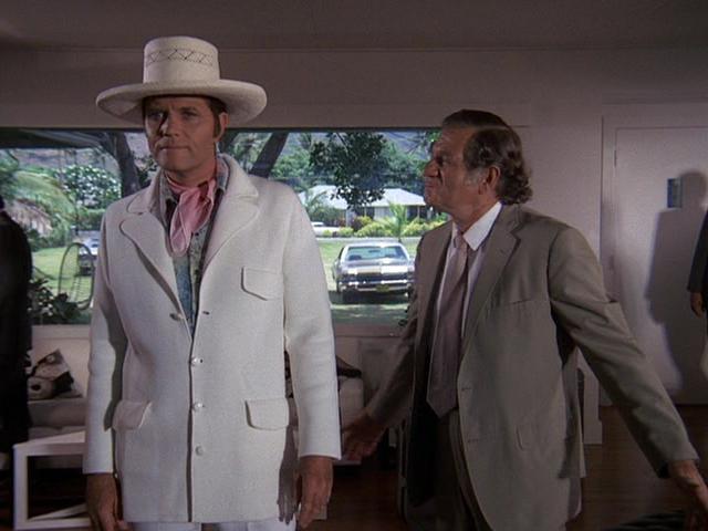 Since her husband Honore Vashon has been locked up for several years, his wife, Margurite, has struggled to stay afloat, especially after the expensive legal fees she had to shell out for her husband's defense and subsequent appeals. In order to make money, Margurite has achieved a certain notoriety and respectability as a Waikiki fashion boutique owner, mixing with the wives of some of Honolulu's business and corporate elite. When one of her husband's old enemies sends death threats against her, the former crime boss's wife turns to the Governor for help. The Governor orders McGarrett to personally provide protection for Margurite, even though the Five-O boss finds anything to do with the family who made his life a living hell repugnant. While McGarrett is at Margurite's trendy store twiddling his thumbs one day, Margurite asks him to act as a human mannequin for one of her new creations. McGarrett finds this highly objectionable, but relents when Margurite picks up the phone and threatens to call the Governor. At the exact moment McGarrett is trying on an outfit which makes the fruity Bea Arthur-like getup in the third of the Vashon trilogy look pretty tame by comparison, both Doc Bergman and Manicote happen to be walking by the shop and see the top cop through the window. They both burst into uncontrollable laughter.