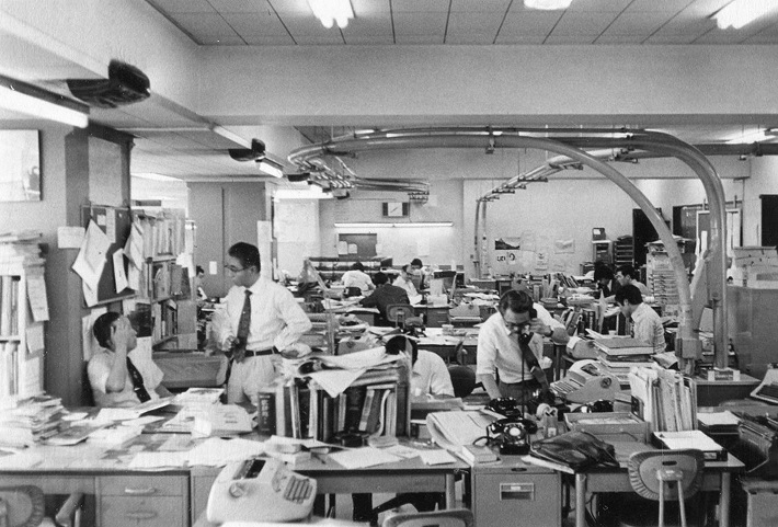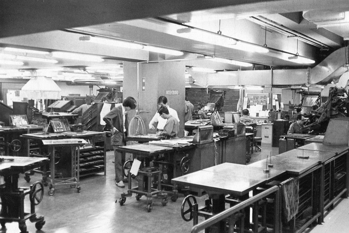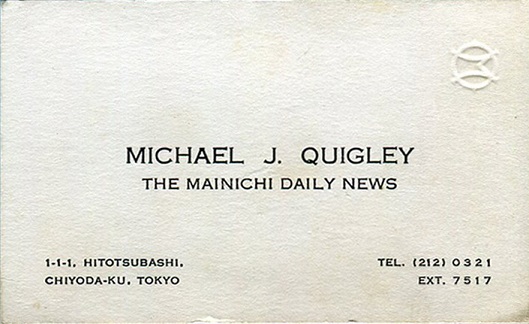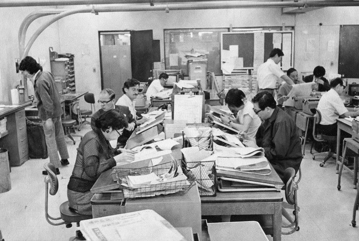 I ended up working as a proofreader for The Mainichi Daily News, the English-language publication of The Mainichi Shimbun, which Andrew had some connection with. ("Mainichi" means "daily," so the English paper's name was actually "The Daily Daily News.") This English paper still used linotype machines with hot metal, not phototypesetting, which became more popular during the 1970s. The paper had articles from news agencies like AP, UPI, and other "foreign" sources, and also had English versions of articles which were in the Japanese paper, translated by Japanese people who wrote and spoke English and worked in a separate department of the Mainichi newspaper building which was located in downtown Tokyo, where I also worked at the proofreading table.