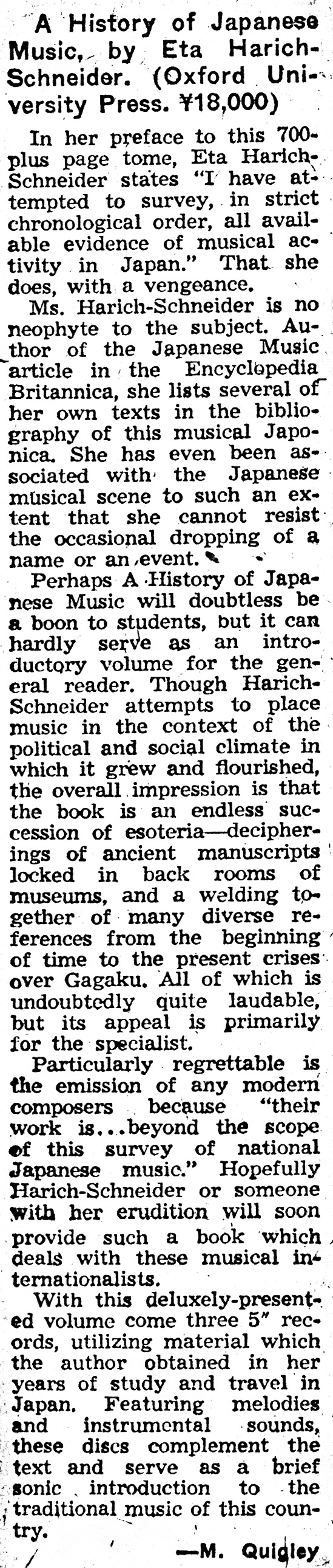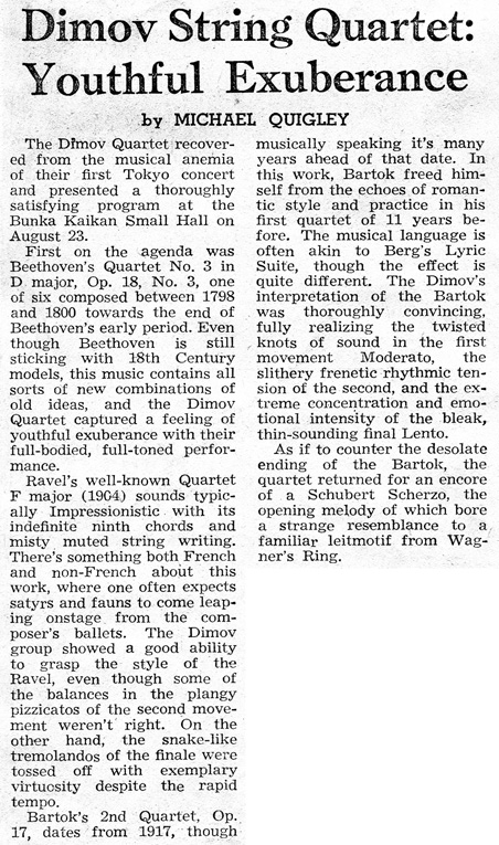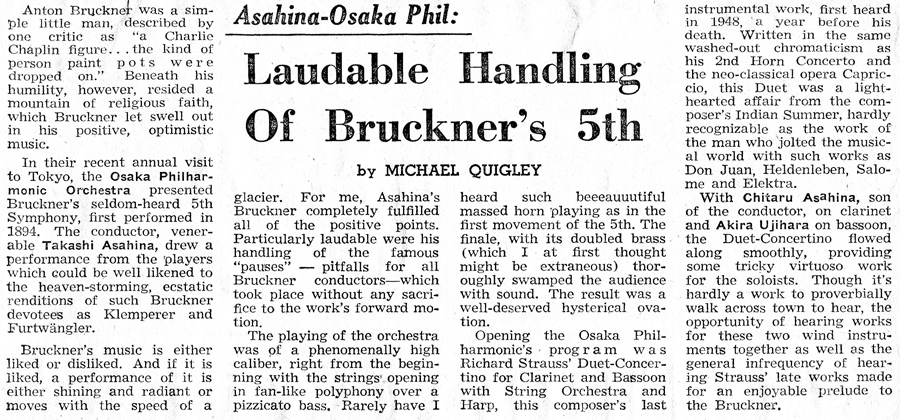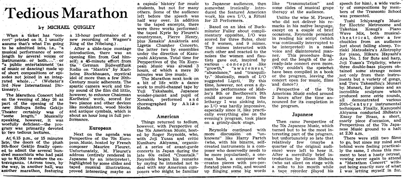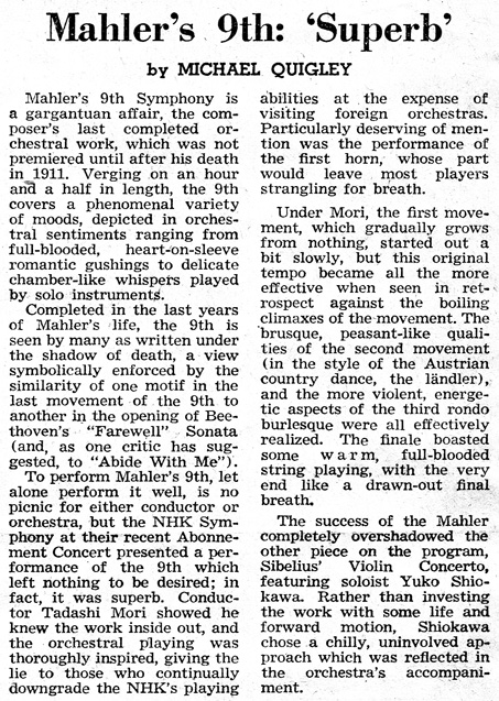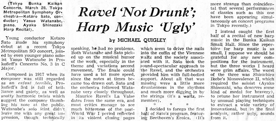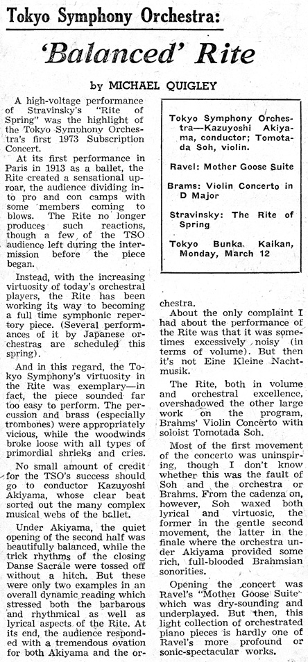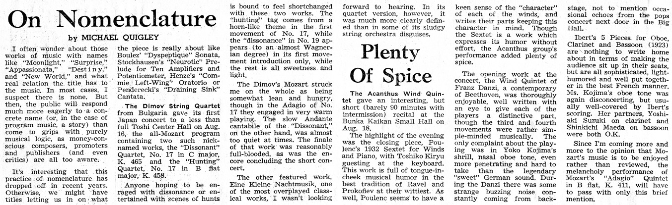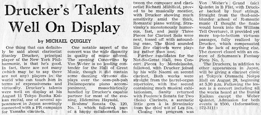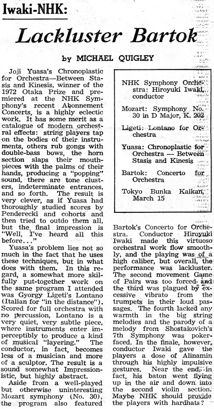 It didn't take long for the guy in charge of the "culture" department at the Daily News, Mr. Nakano, to find out what I had been writing about back home (because I told him), so I was assigned to cover concerts and write other articles of interest during the 10 months I stayed in Japan.