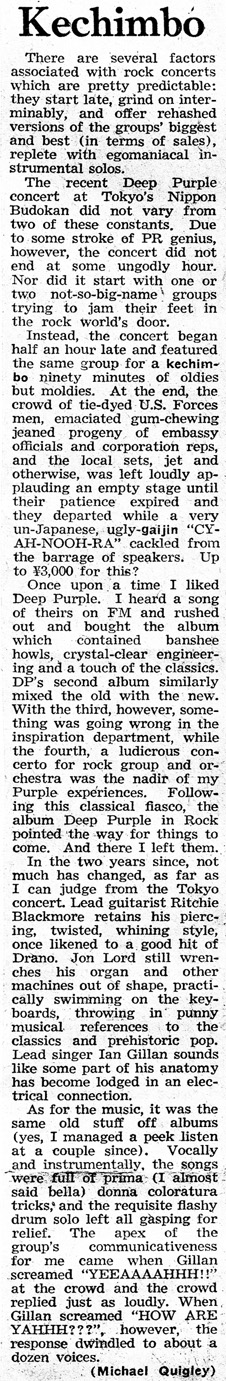 With the exception of the Quad article, the dates below are the dates of the concerts; I no longer have access to the newspapers where the articles appeared. The word "kechimbo" on the Deep Purple review, by the way, is the Japanese word for "stingy."