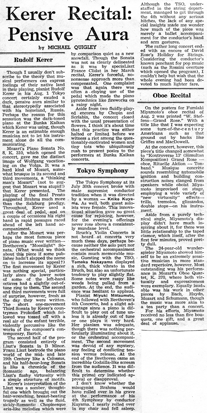 3 Reviews: Rudolf Kerer, piano (Aug. 1, 1973); Tokyo Symphony, cond. Keiko Kuyama (July 30, 1973); Oboe Recital (Aug. 2, 1973)