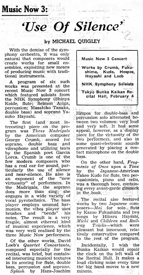 Music Now 3 Concert, NHK Symphony Soloists (Feb. 4, 1973)