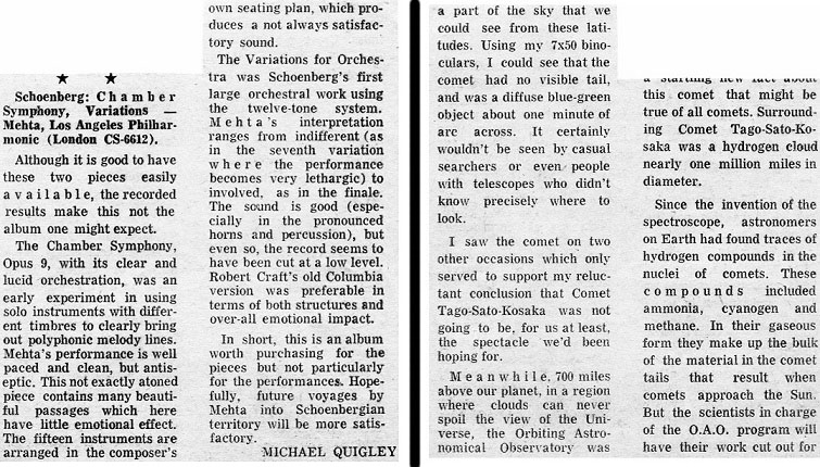 The Georgia Straight and The Grape, though I still contributed to The Province occasionally. I was away in Japan from November 1972 to August 1973, and when I returned, I started freelancing at The Province again, writing over 100 more reviews until 1976, when I stopped because I was making the same amount of money per review ($25 each) which I had made since I started there 7 years before.Aside from my own clippings, I managed to track down almost all but one of the articles from The Province via the ProQuest service at the Vancouver Public Library. I am told they are also available on newspapers.com. Only one article was untraceable, a review of recordings by Schoenberg, which I think fell through the cracks between the different "star" editions.