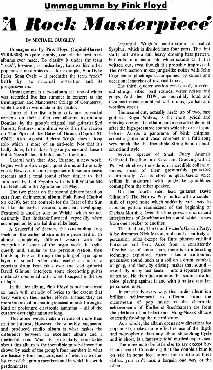 This interview was conducted before Pink Floyd's first Vancouver concert in October of 1970. Despite a whopping hangover, I managed to struggle out to the PNE Gardens where the concert was being held. I managed to get to talk to Roger Waters and David Gilmour after showing them a rave review of their album Ummagumma I had written in February of that year for the University of B.C. paper, The Ubyssey in which I described it as "one of the best rock albums ever made". The interview appeared in the October 14-21, 1970 issue of the Georgia Straight. The issue of the paper containing this interview can be seen at the Internet Archive. Copyright ©1970 by Mike Quigley. No reproduction of any kind without permission.