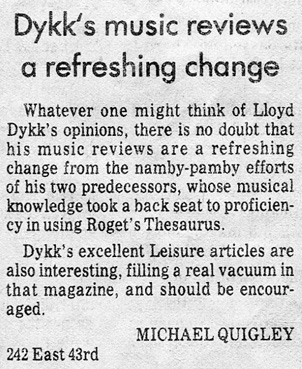 Headline: "Dykk's music reviews a refreshing change"