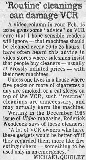 Headline: "'Routine' cleanings can damage VCR"